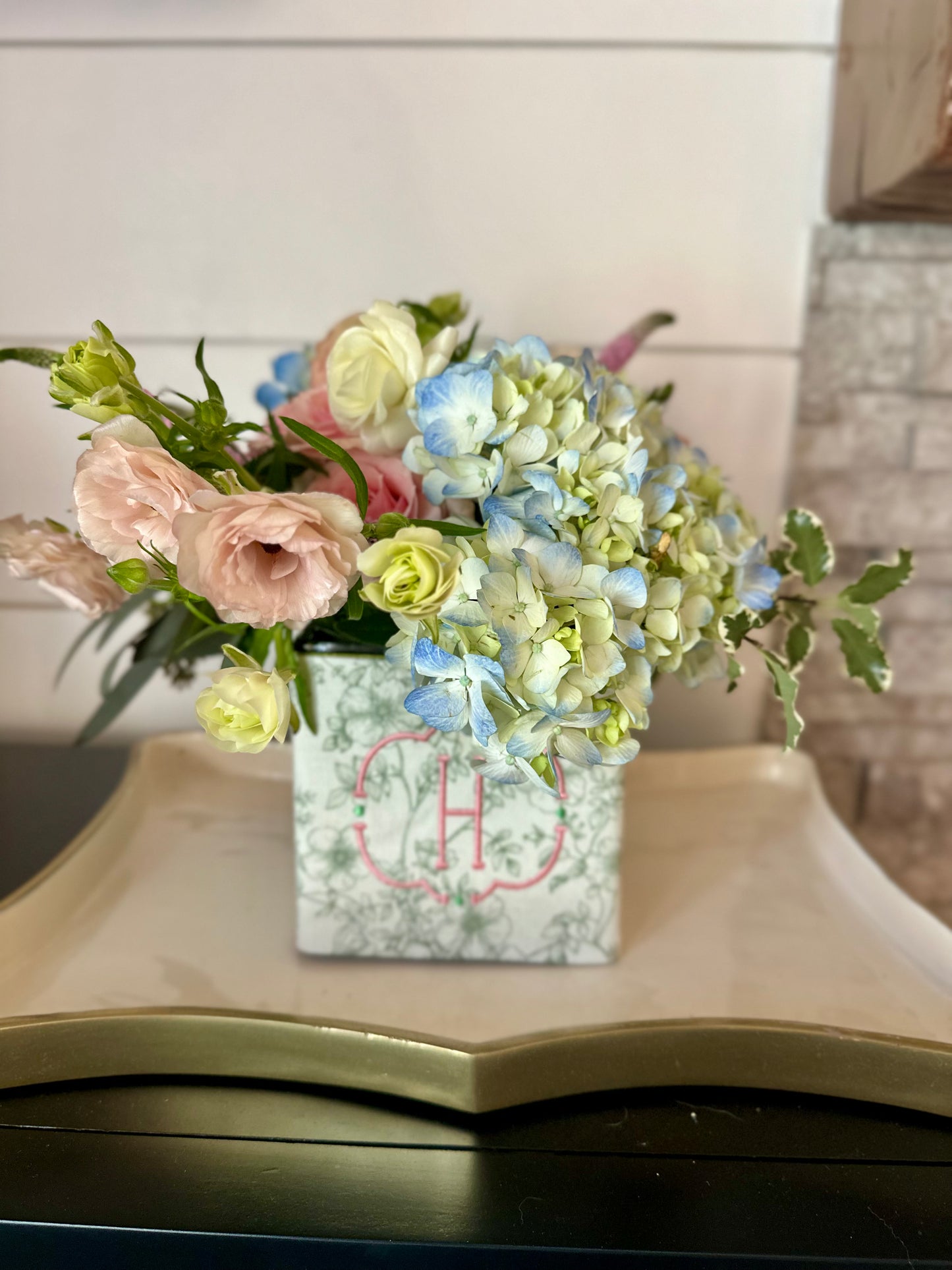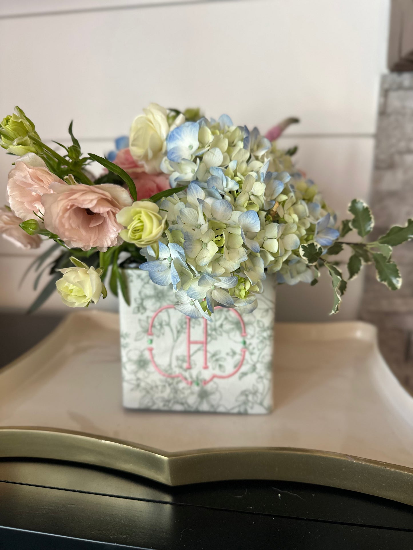 Our monogrammed vase wraps are designed to slip around a glass or ceramic vase, instantly transforming everyday flowers into a polished, meaningful presentation. Finished with a custom embroidered monogram and soft, classic patterning, this piece adds texture, personality, and intention to any arrangement.